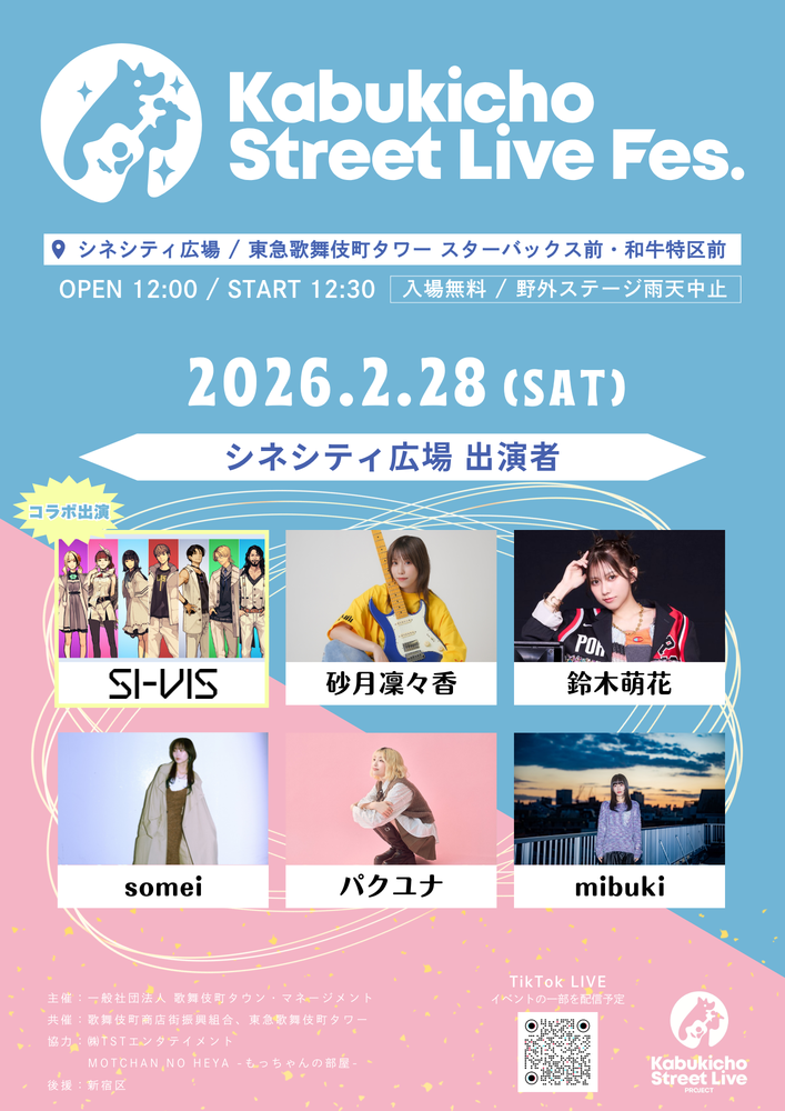 「SI-VIS」フルメンバーの出演が決定した、2026年2月28日(土)に新宿・歌舞伎町にある、「東急歌舞伎町タワー」敷地内での"公認ストリートライブ"「Kabukicho Street Live Fes.」のタイムテーブルが公開されました!「SI-VIS」は14:50からシネシティ広場での出演となります。
