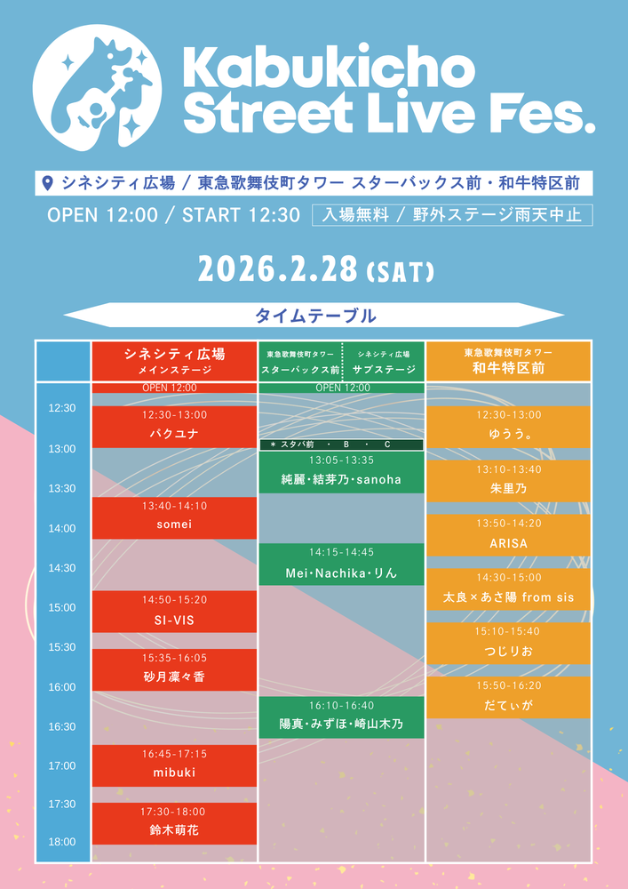 2/28(土) "公認ストリートライブ"「Kabukicho Street Live Fes.」タイムテーブル公開!